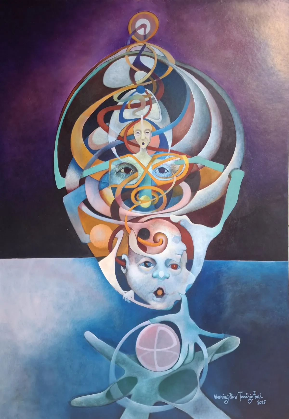 It visually explores the Vipassana meditation process, rooted in deep introspection and the purification of the mind. Inspired by a silent 10-day Vipassana retreat in Worcester, the work transcends the physical act of meditation to reflect spiritual transformation and heightened awareness. The chakra-based colour symbolism emphasizes energetic alignment throughout the journey.